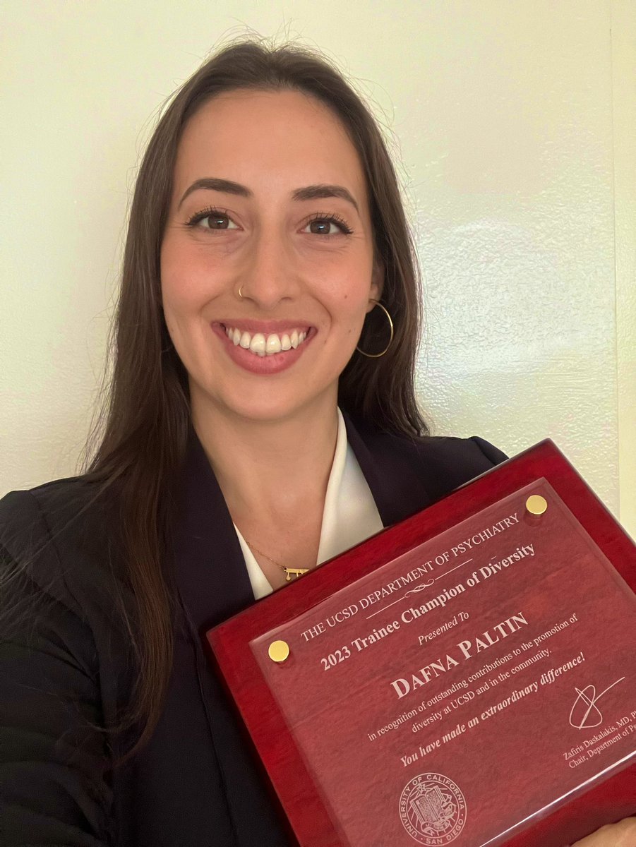 Congratulations to Dafna Paltin for being selected as the 2023 Trainee Champion of Diversity Award winner for the UCSD Dept of Psychiatry! She was chosen among an incredibly dedicated group of nominees, and was recognized by the selection committee for excellence in all the areas.